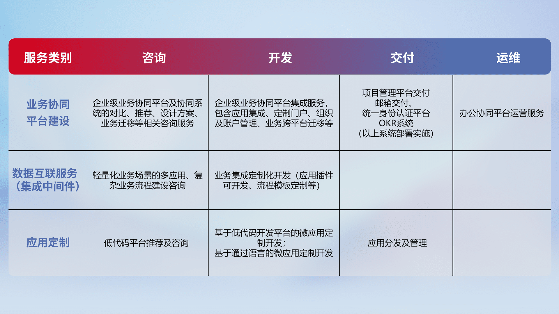 针对钉钉、、、企微、、、IDaas等平台级产品提供产品的规划、、、方案、、交付、、、定制化开发等服务,,实现如统一协同办公、、智能客户服务、、、混合会议管理、、、、智能数据查询、、、等业务场景,,,,实现数字化转型。。。。